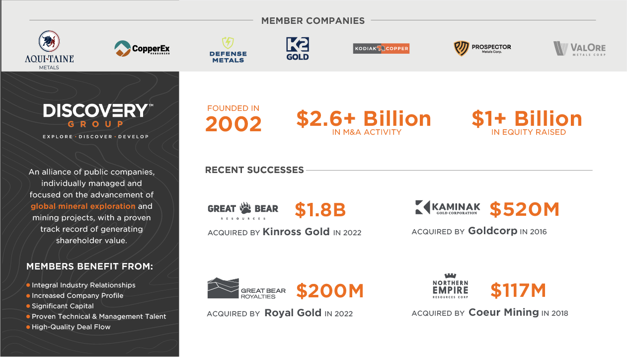Our companies leverage the collective experience acquired from Discovery Group’s™ previous meaningful discoveries - including Kaminak Gold, Northern Empire Resources, Great Bear Resources, and Kodiak Copper - in project vetting, team building, market-facing communications, and corporate development.