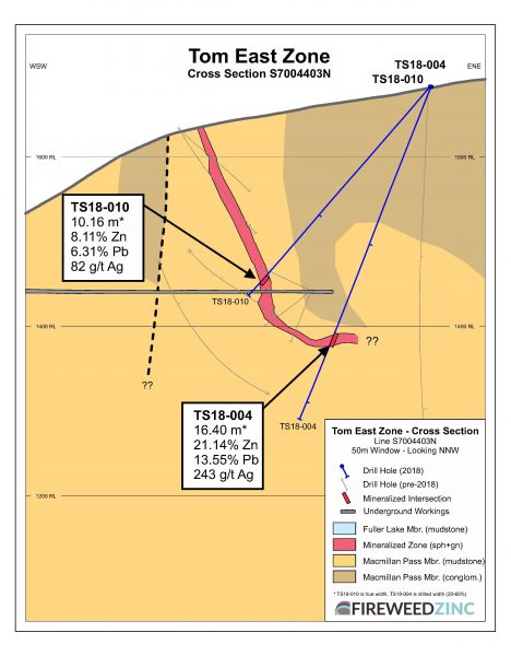 The first target to be core drilled this summer will be Tom North. Interpretation of historic drilling and trenching results immediately north of the Tom West deposit led to the delineation of a new step-out drill target with large upside potential: Tom North. Six shallow holes drilled at Tom North in 1951-52 plus one additional hole in 1978 returned assays up to 5.05% zinc and 1.80% lead over 19.9 m (see other drill results on Figure 2)1. Fireweed drilling elsewhere at Tom demonstrated that many early historic drill results under-reported grades due to poor core recoveries with small-diameter historic core. Drilling with modern large-diameter core at Tom West in 2017 and 2018 improved core recoveries and improved grades (see examples in 2017 and 2018 Fireweed drilling news releases). Mapping and 2018 exploration data suggest that Tom North may be an extension of Tom West separated by a fault. The Tom North target has been traced in sparse historic drill holes and trenches over a strike length of 600 m and only to shallow depths of about 50 m. Fireweed plans to drill the continuation of Tom North at depth to test its potential for mineralization amenable to open-pit mining and to test for thicker
