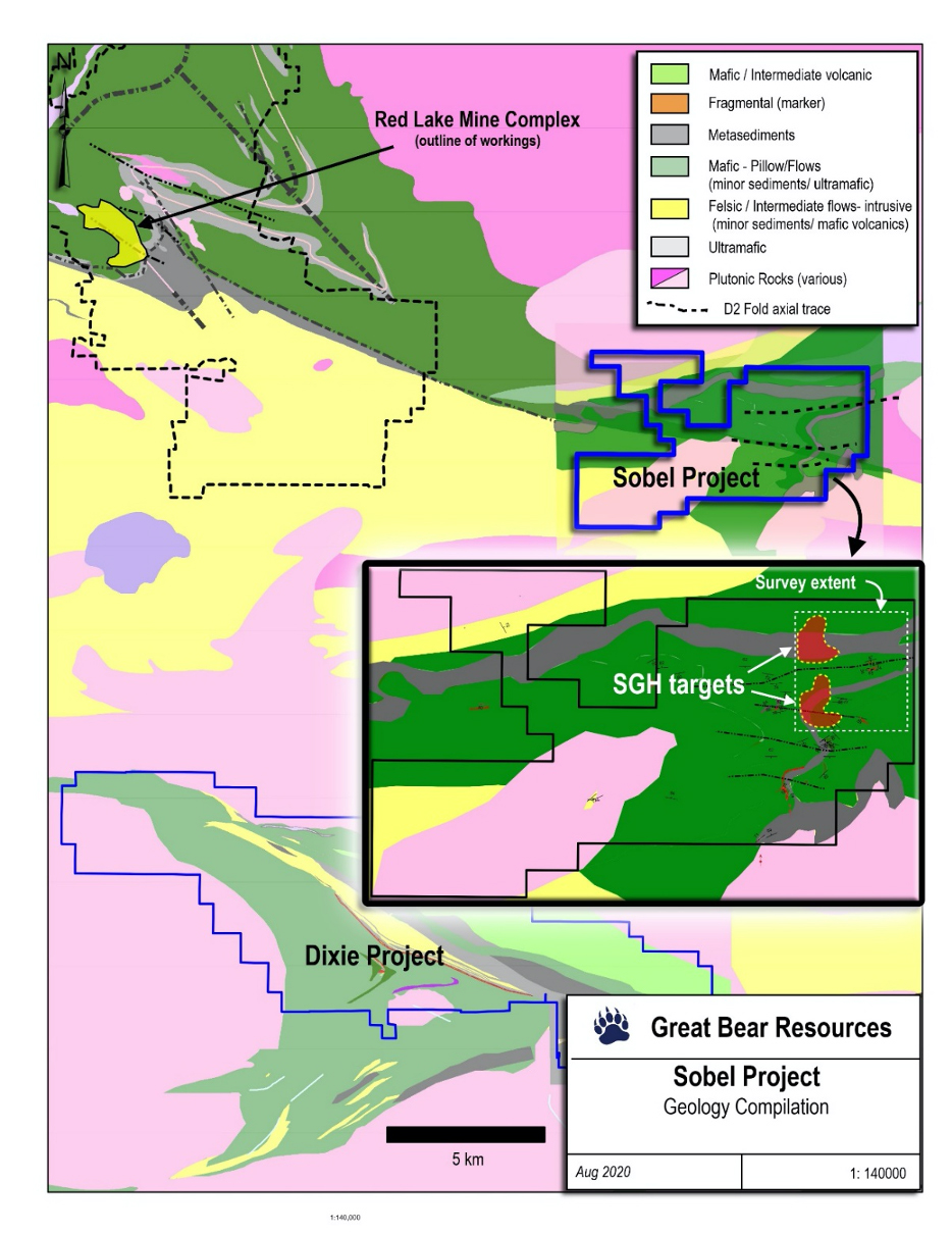 Figure 2: Geological map of the Red Lake Mine Complex and Great Bear's Sobel Property. Locations of the newly discovered SGH targets are shown in the inset. The location of the Dixie Project is also shown.