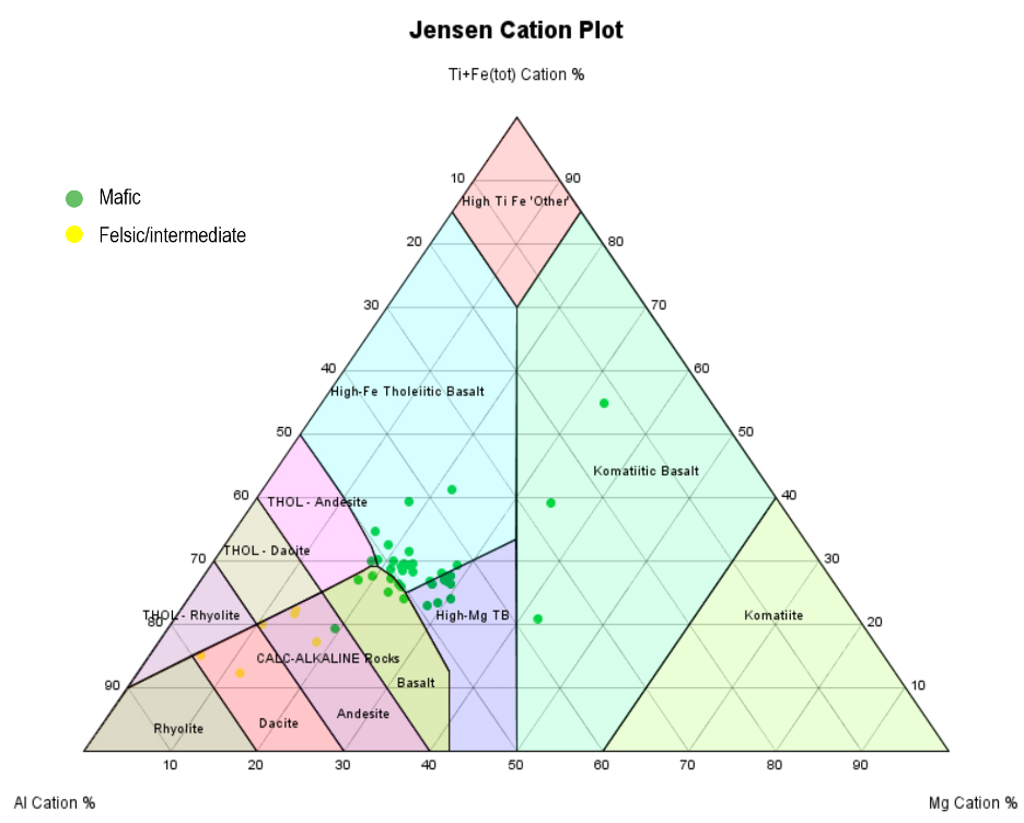Figure 4: Jensen cation plot of geochemical results from mafic and felsic rock samples collected at the Sobel Property.